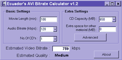 The second version of my program is actually a compilation of calculators optimized for use with the various steps of various DVD to DivX methods, as it was created to accompany my Rip-Packs. Nevertheless, most features are also usefull for any other DVD to AVI / xVCD etc conversion. The program was tested under Windows 98SE, Me 2000 and XP with large and small fonts (looks better with small fonts) and is distribued as freeware. The "deluxe" version, in addition to the calculators, features a PCM WAV normalizer.